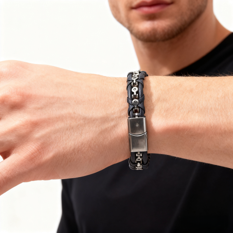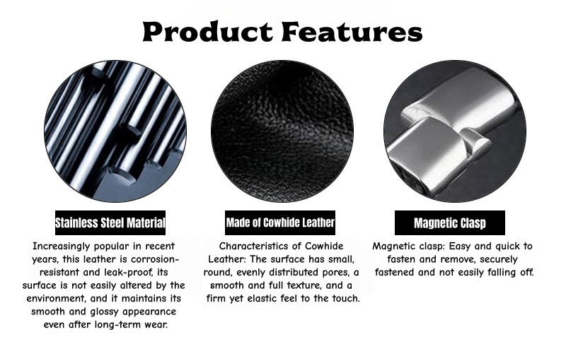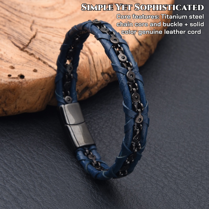 The titanium steel buckle is scratch-resistant, fade-resistant, and hypoallergenic, making it suitable for sensitive skin; the genuine leather cord is soft and skin-friendly, and won't constrict your wrist even after long-term wear. Compared to all-metal bracelets, it's lighter, while all-leather bracelets are more durable, combining the advantages of both materials.