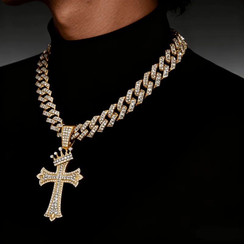 This fully micro-painted diamond crown cross pendant features an eco-friendly electroplated chain, a seamless crown cross design, and dazzling brilliance from the diamonds; under light, each diamond sparkles with dazzling brilliance.